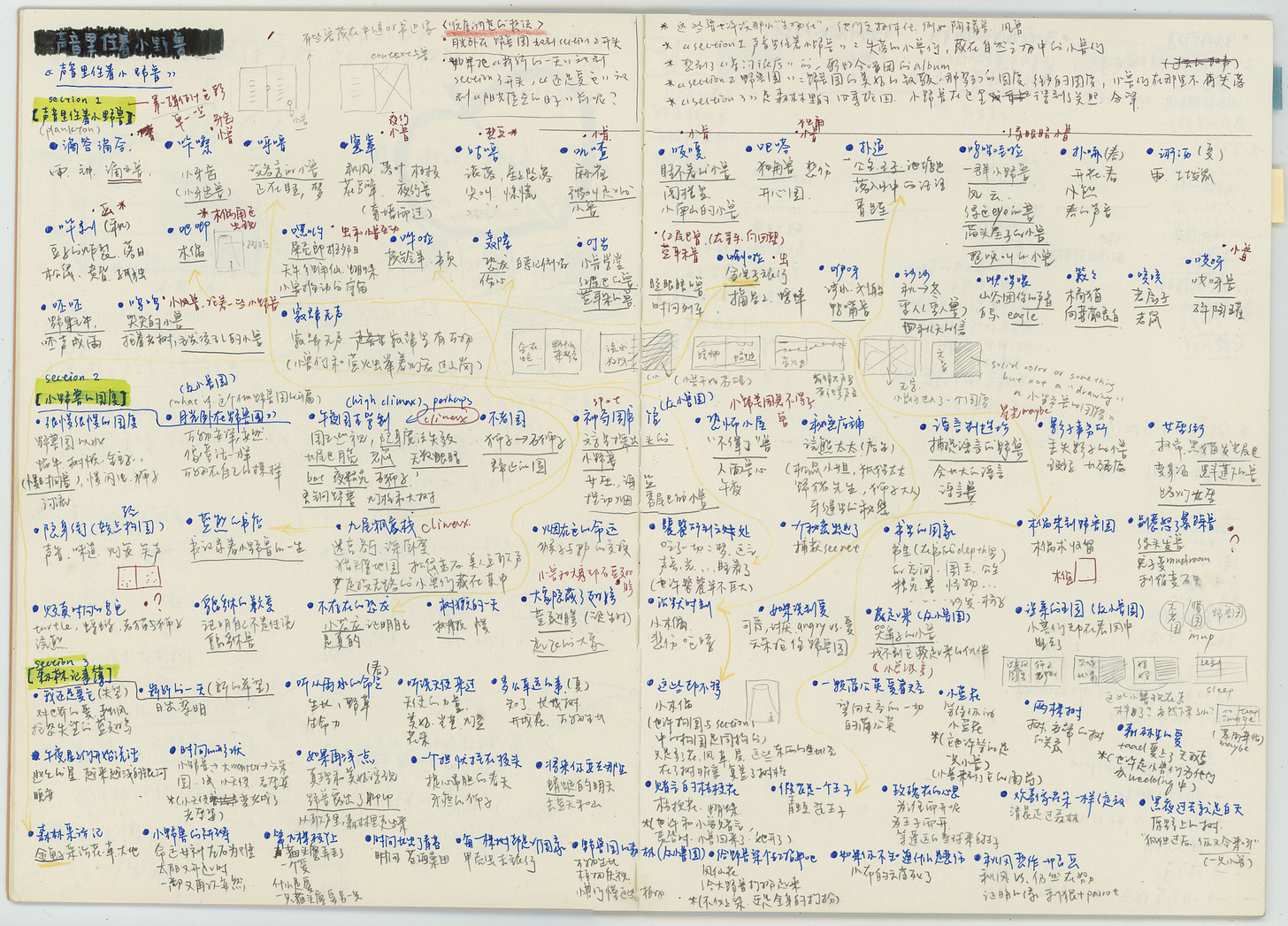 有了这个大方向的设想后,我一边读诗一边做笔记,写了两页密密麻麻的「小抄」。这些小抄里主要整理了这样几方面内容:1)每首诗里出现的小野兽或关键角色意向; 2)这首诗的气质,例如是否是个场景高潮;3)站在我的创作视角来看,一首诗是否和其他某一首诗有关系,比如是否也许或明或隐地写到的是同一个小野兽角色——如果你仔细看,会发现一些黄色铅笔画的箭头,连接起在我看来「有关系」的诗与诗。