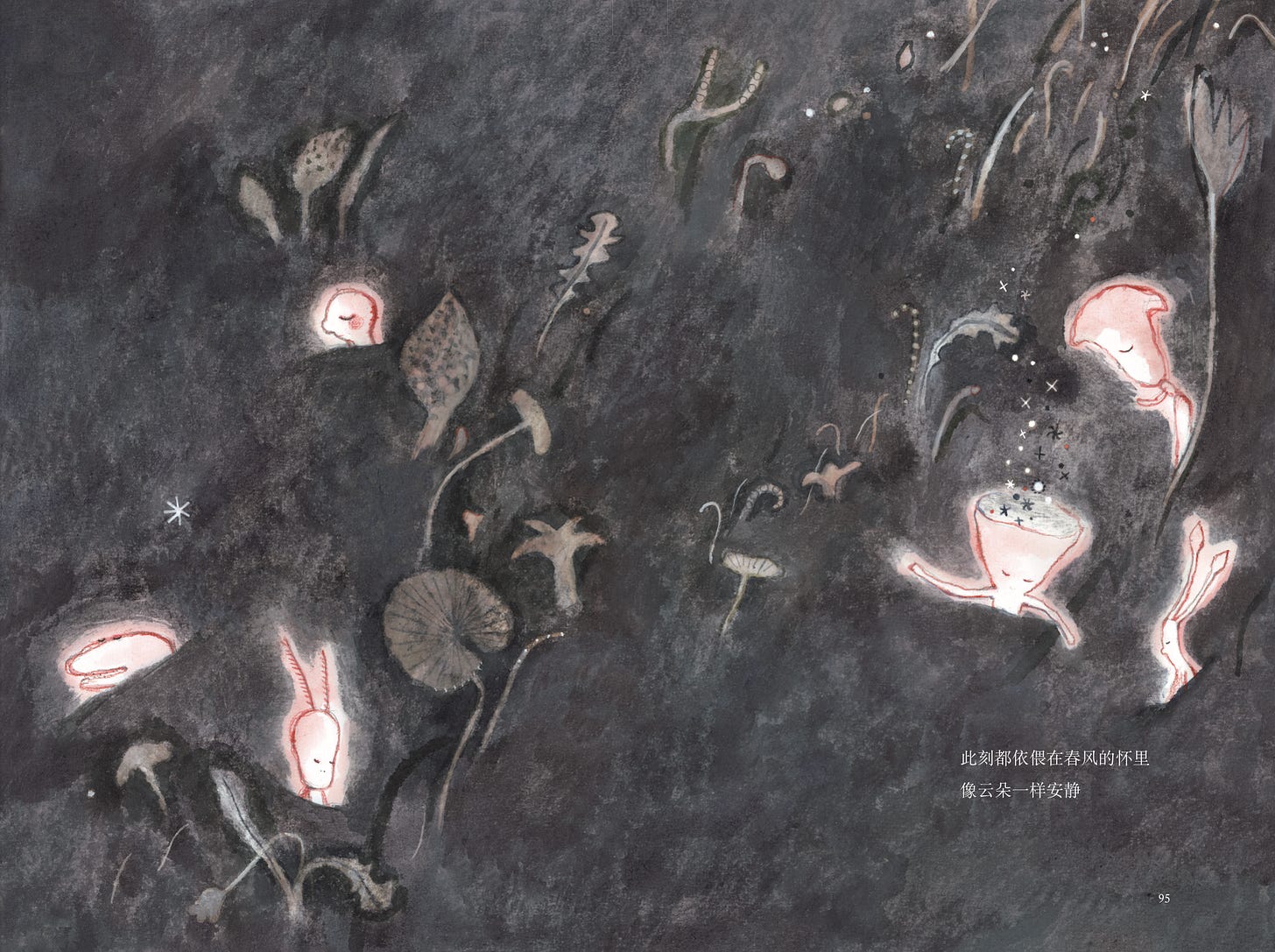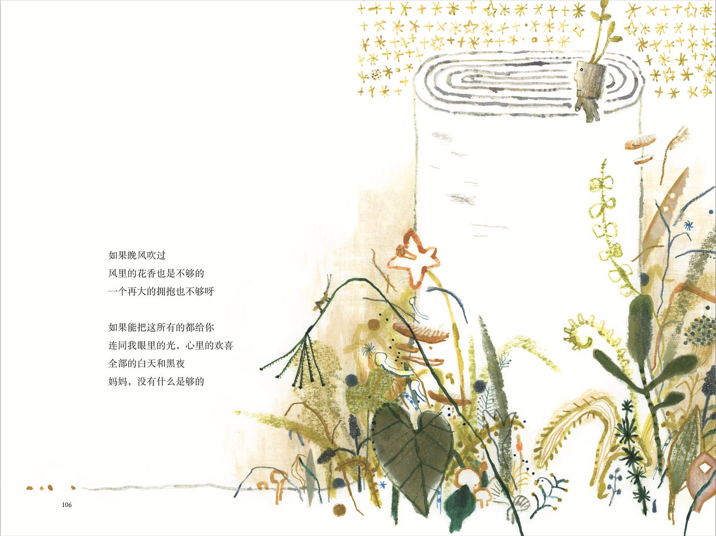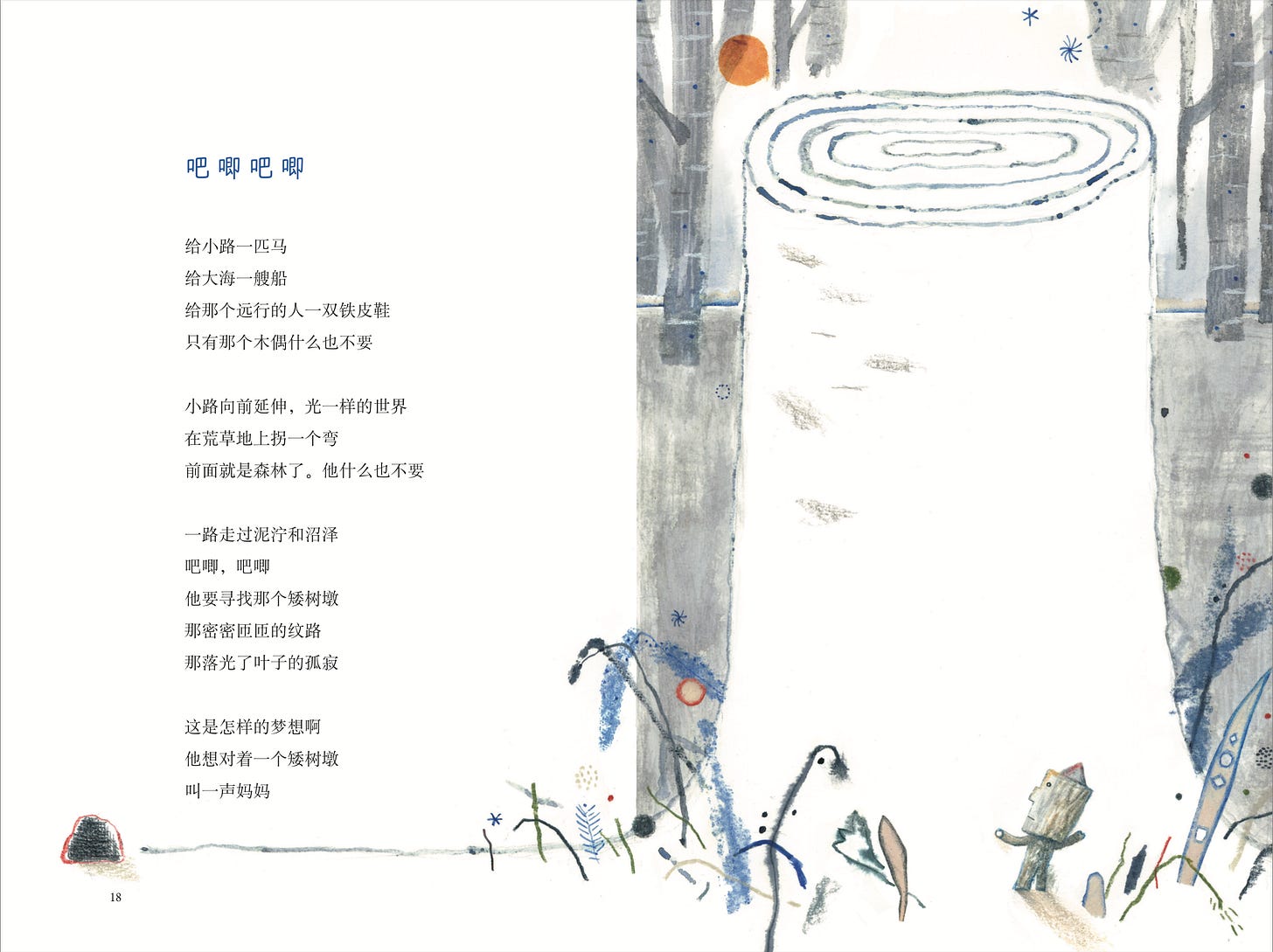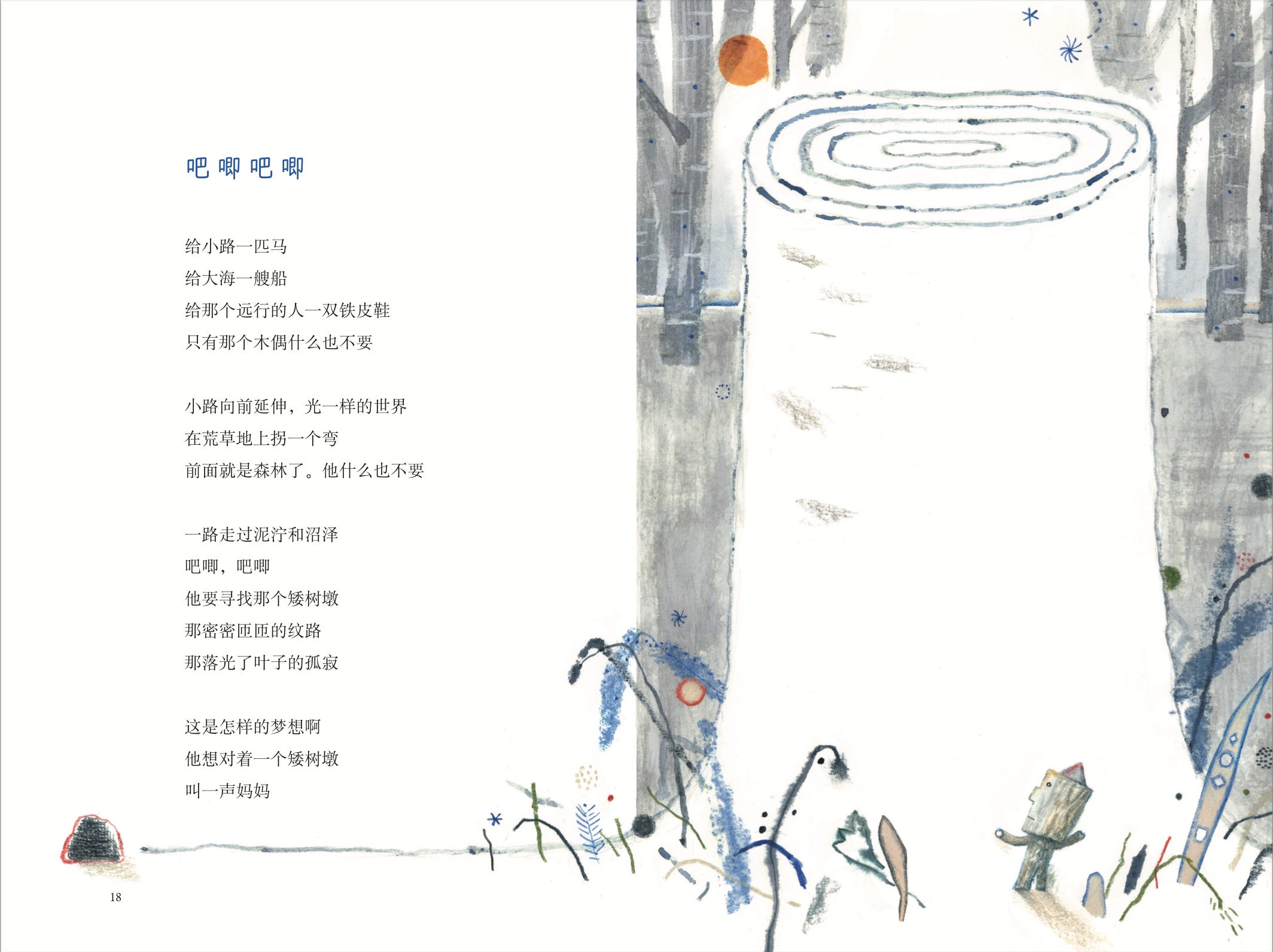 因此,在这几首诗中,我都安排了木头人出场。而且,在《这些都不够》中,我给了木头人一个交代:同样的老木桩,周围已经生出茂盛又活泼的野草,妈妈也许无法在回来了,但星星啊森林啊与你作伴。只是我作为图像创作者给木头人的安慰。