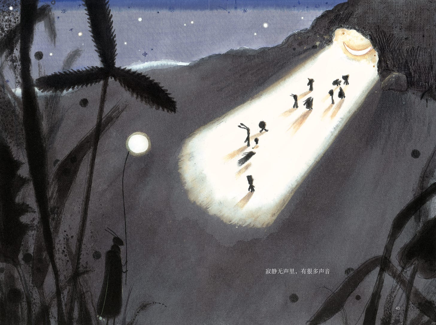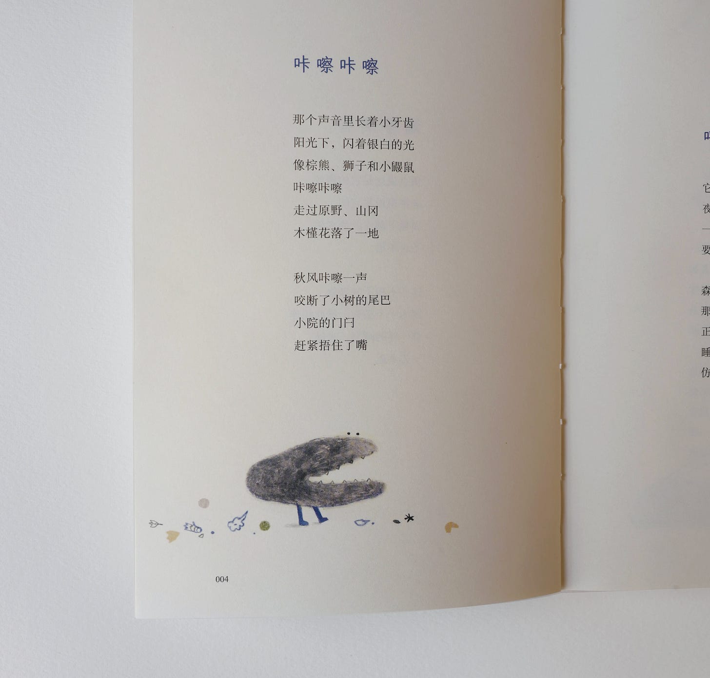 一百多首诗被作者分成了三辑:《声音里住着小野兽》《小野兽的国度》《野兽国的森林》。第一辑一出现就很吸引人——这辑中所有的诗都以拟声词为标题:滴答滴答,咔嚓咔嚓,呼噜呼噜,窸窣窸窣……叮叮当当,沙沙沙,呸呸,呜呜……为这一群以拟声词为题目的诗歌收尾,是一首题为《寂静无声》的诗,我在这里摘下这首诗结尾的几句: