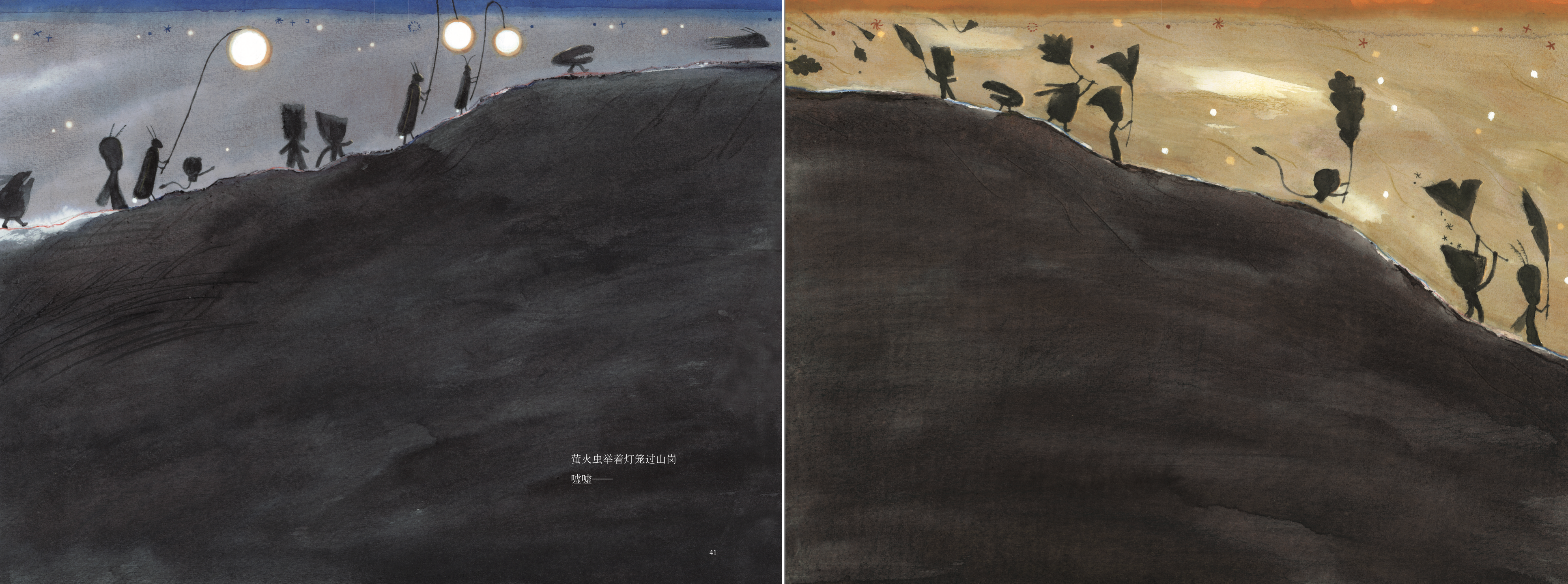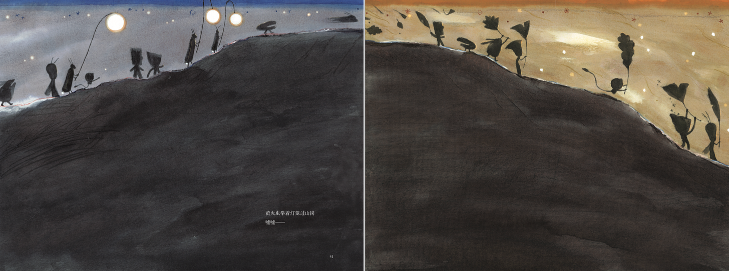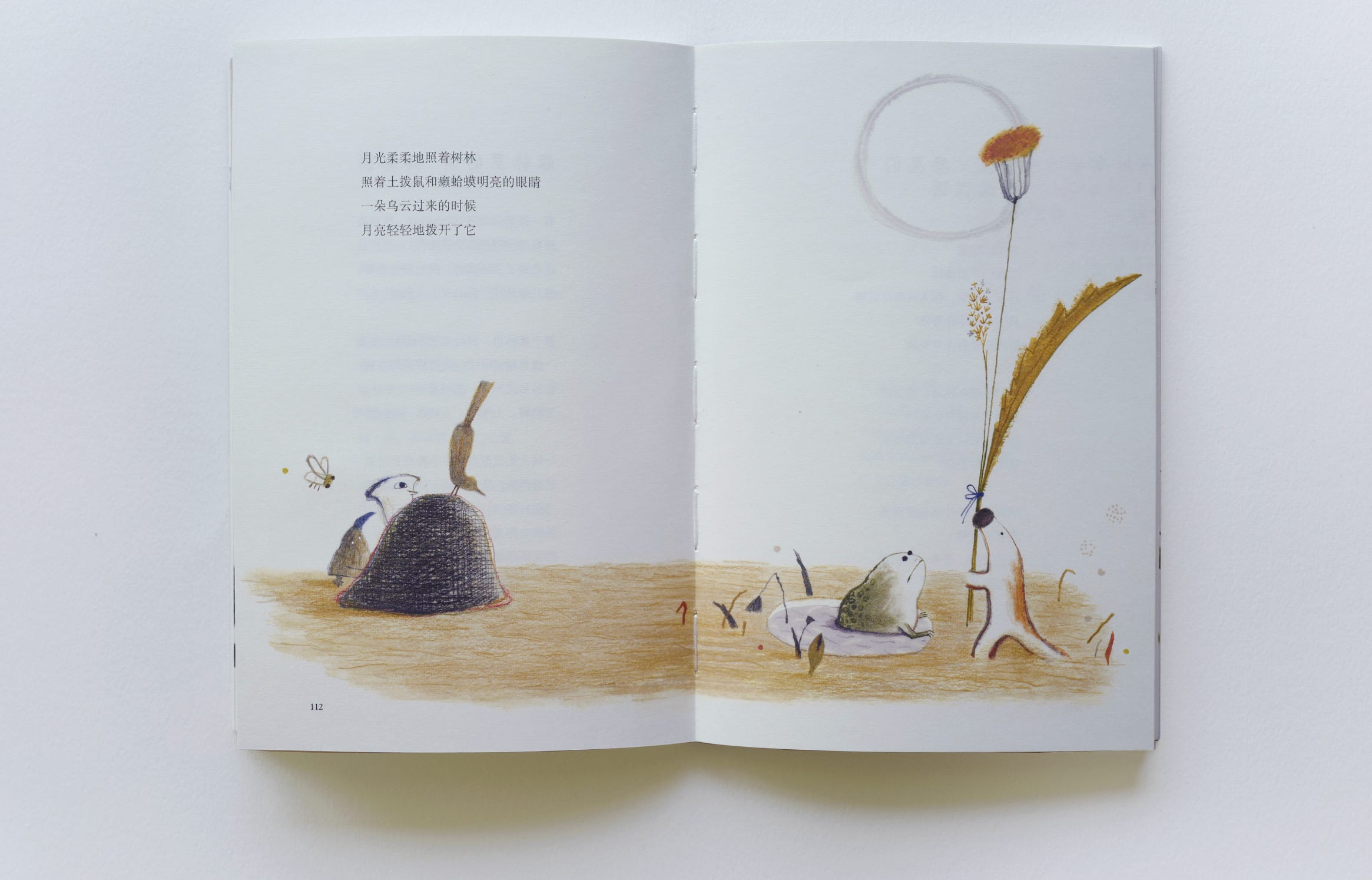 在创作这本书时,我不太把自己当做一个「插画师」,我也不希望插图只是诗文的装饰。我把插图看作一种参与叙事的内容。为哪首诗配插图,为哪首诗不配插图,不简单地源于我喜不喜欢一首诗,而来自于叙事和阅读体验的功能需求——这里是否需要有一张插图介绍这个角色出场?这里是否要有一个单页全图来烘托氛围调整阅读节奏?这里是否要有一张插图来呼应之前出现的一幅图?这里是否要安插一张插图以调整排版顺序,使得XX诗歌能获得一张跨页插图的版面……