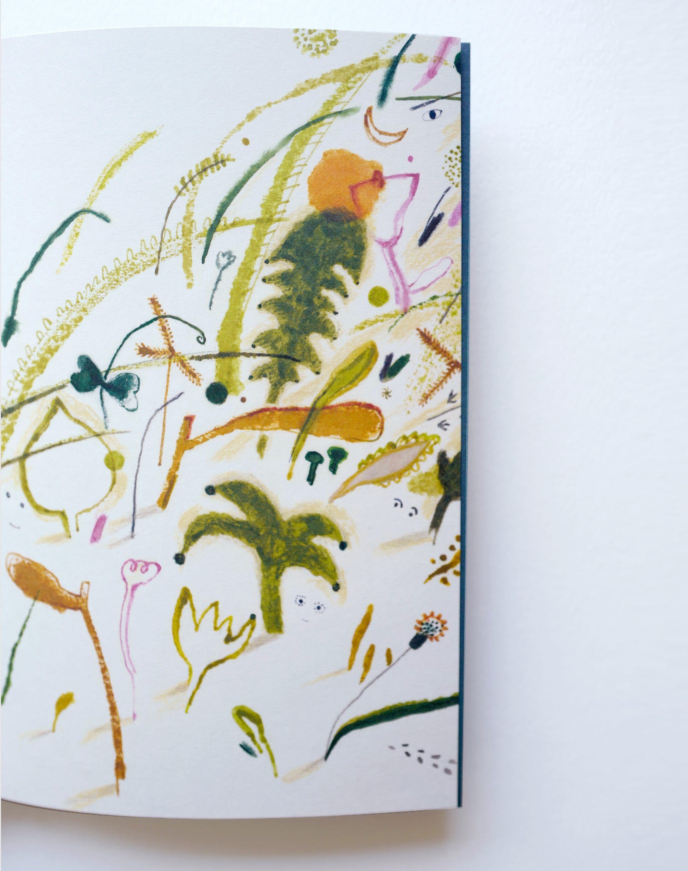 第三辑有更多的植物描述,也有很多生命力的场景。我对插图在第三辑的功能是希望插图能够把小野兽从轰烈的「野兽国」中带出来,让他们重归森林,但这个森林不像第一辑中的森林那样没有生命感。小野兽们在第三辑萌动。因此,这一辑采用的是黄绿色的色调,也为结尾处最后那一页「万物萌生」做色彩铺垫。