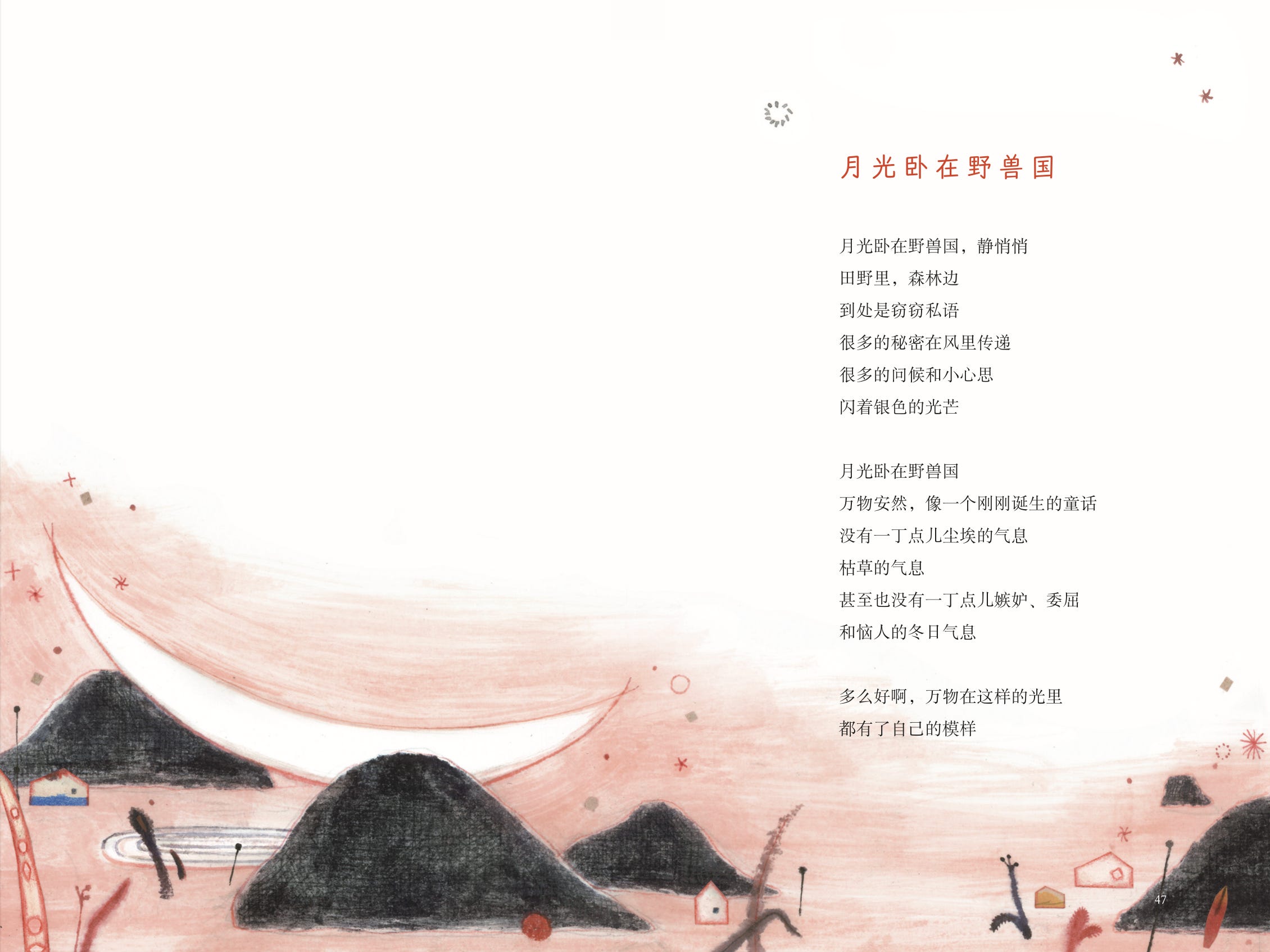 第一辑以《寂静无声》收尾,野兽们举着灯笼上山岗,他们走到了一个发光的洞口,那里有一只卧着的月亮。而刚刚好的时,这「卧着的月亮」可以接上第二辑开篇的诗《月光卧在野兽国》。也许这时你可以理解,这时我脑中舞台上幕和幕之间布景的衔接与切换。