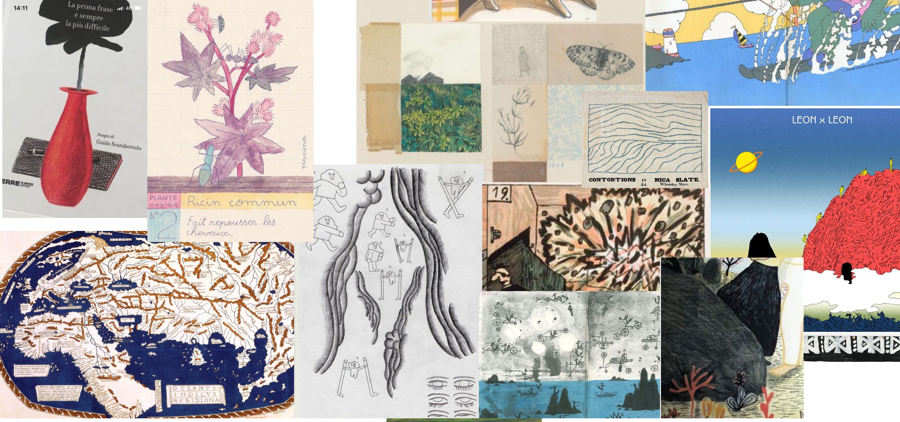 做绘本,分镜一直都不会太困扰我。最困扰我的总是「探索恰当的画面风格」这个阶段。最近我就深陷于这个麻烦的环节中——研究、尝试这本书应该用怎样的色彩、材质和画法来呈现。我希望画面是质朴的、歌谣感的、略微复古的,有一些图案符号化的处理、也有一点天真的童趣感。我陆续画了一些小图来「定调」,也搜集了许多参考图来做意向板(moodboard)帮助我自己找感觉: